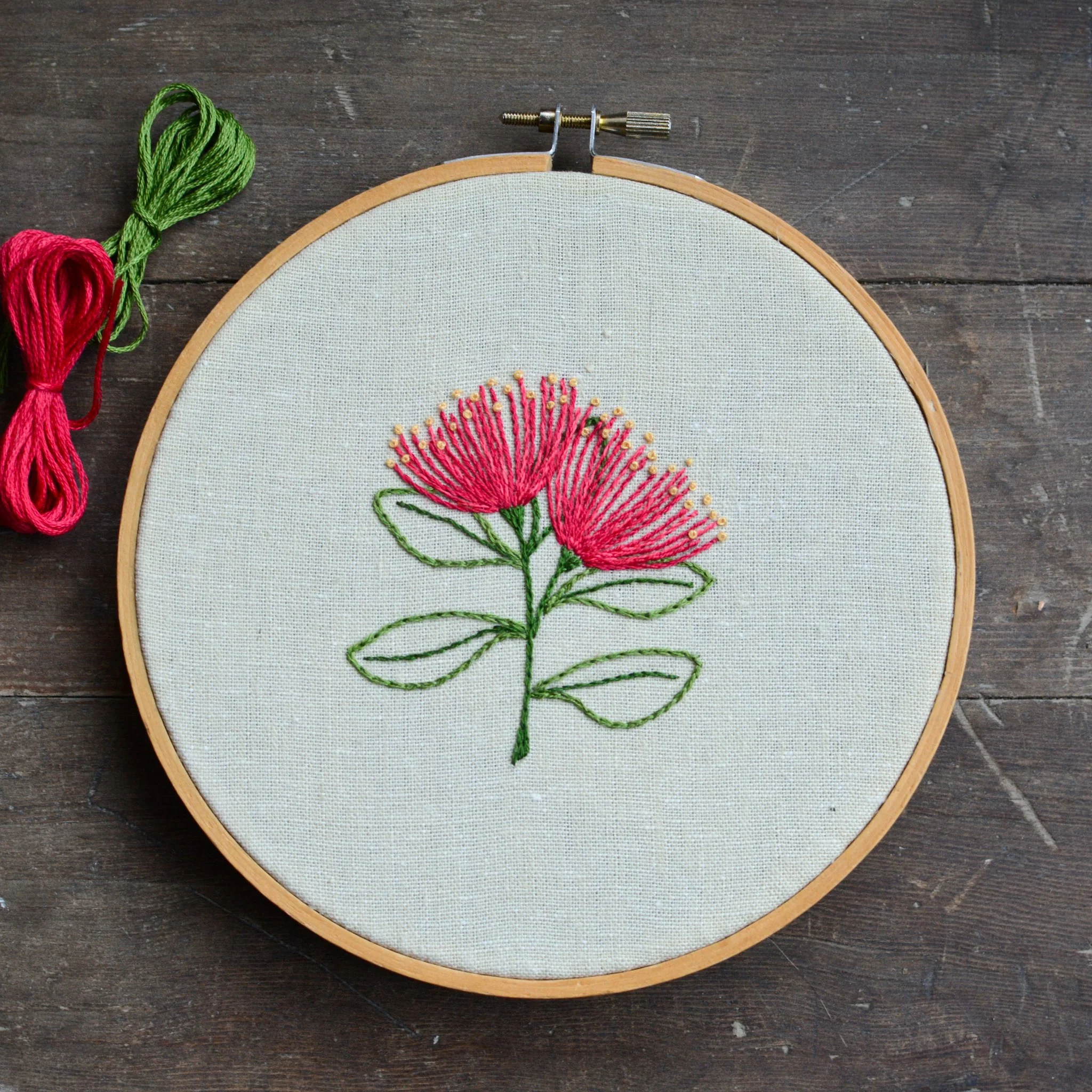 Use basic embroidery stitches to create beautiful pōhutukawa flowers in multiple sizes and layouts.